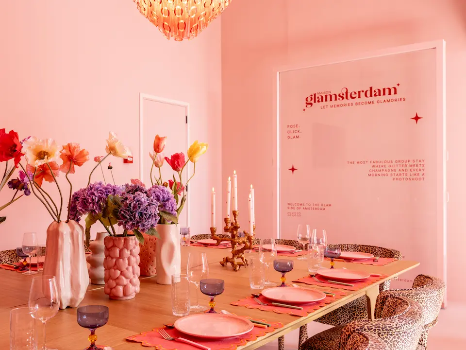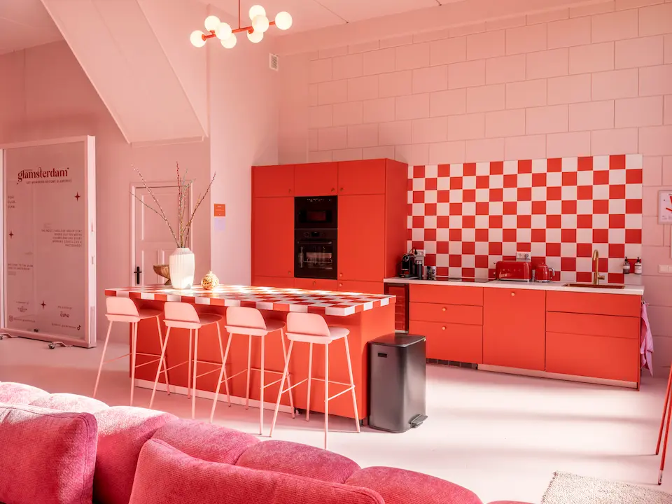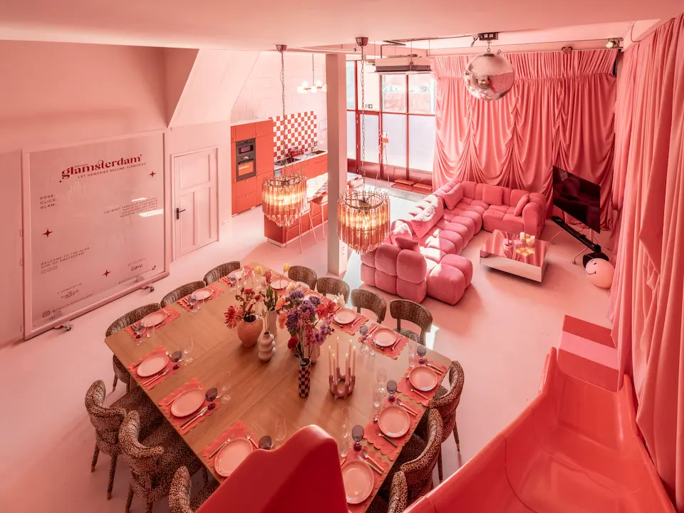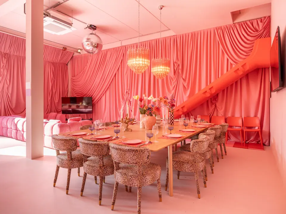 The Living & Kitchen area is where the whole house comes together. A bold pink lounge, a long dining table for unforgettable dinners and a statement kitchen made for late-night snacks and slow morning coffees. Two large screens make the space flexible for every type of stay: one by the sofa for lazy Netflix mornings and another that can be used for presentations, meetings or group moments. With powerful JBL soundbars throughout the room, music always feels part of the atmosphere. The kitchen itself is fully equipped with everything you might need, making it just as perfect for group dinners as it is for late-night snacks.