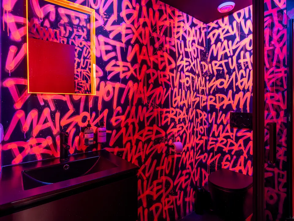 The Neon Nights Bathroom brings pure late-night energy into the house. Dark walls covered in bold graffiti glow under vibrant neon lighting, creating a space that feels somewhere between an underground club and a street art gallery. The reflections, colors and attitude make even a quick stop feel like part of the night out. At Maison Glamsterdam the party doesn’t stop when you leave the dancefloor, and in the Neon Nights Bathroom the glow keeps going.