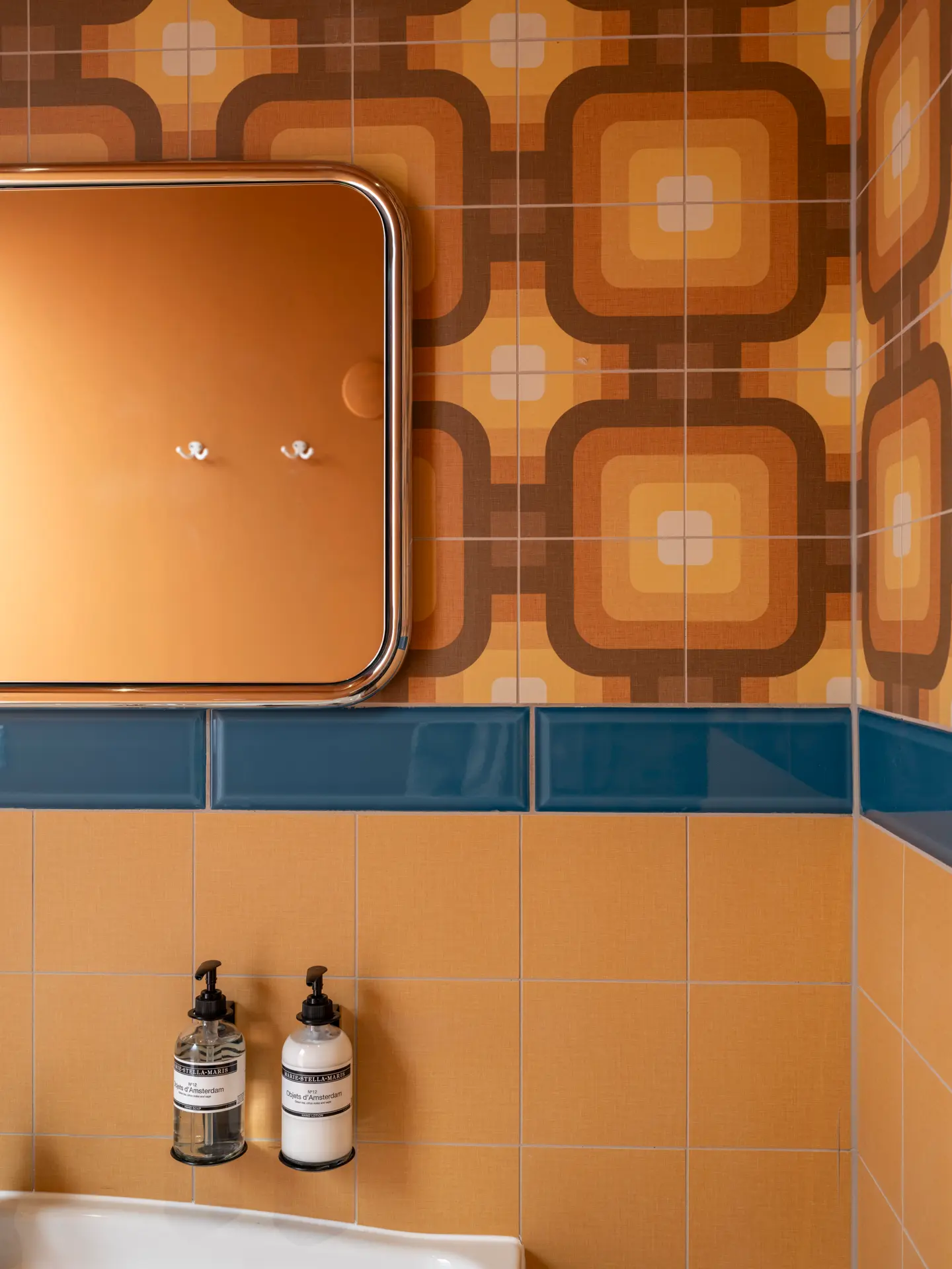 The Retro Bathroom is a playful nod to vintage design, filled with bold patterns, warm colors and classic tiles that feel straight out of a stylish 70s interior. The graphic wall patterns, retro sink and contrasting tiles create a space that is both nostalgic and surprisingly fresh. It’s the kind of bathroom where getting ready becomes part of the experience rather than just a quick stop. Because at Maison Glamsterdam even the smallest rooms are designed with personality.