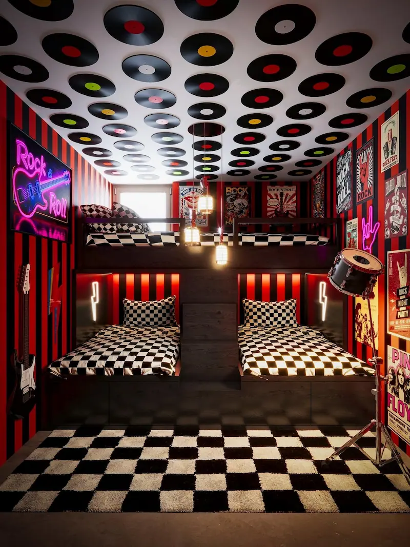- Check in as the rockstar of the show in the Rock & Roll room (3p - 3 single creative bunk beds)